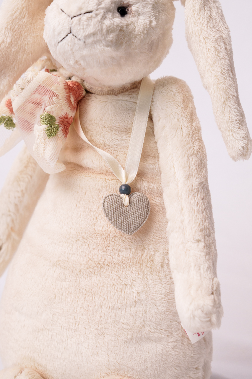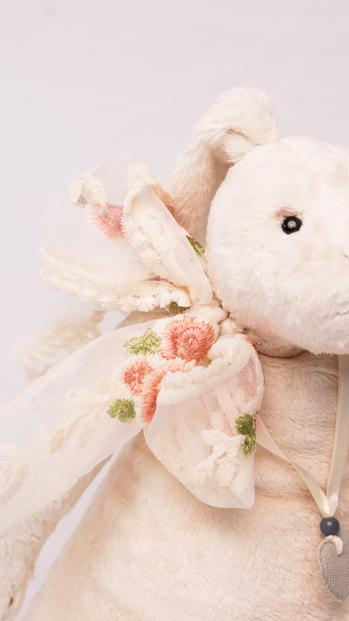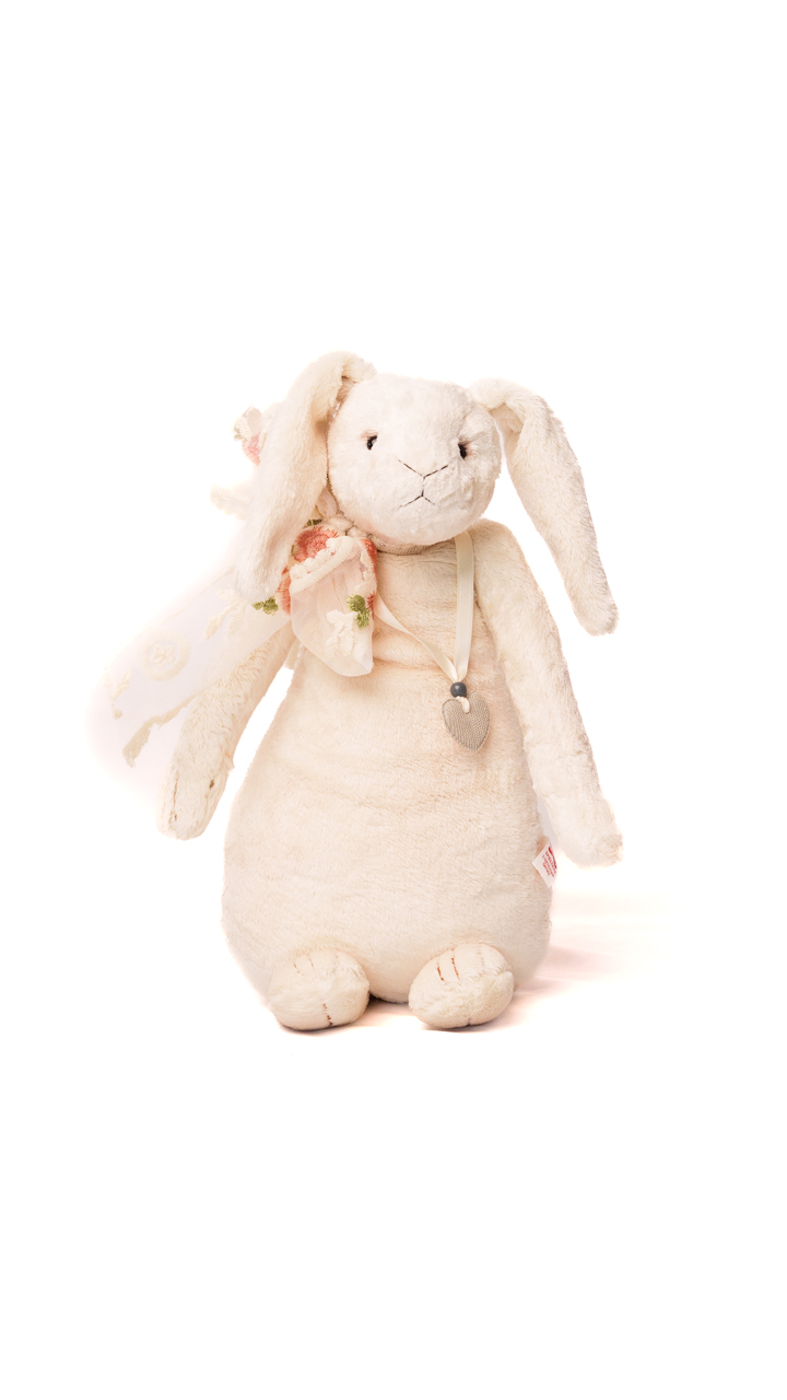 Flora Bloom is a premium plush bunny in pure white. Measuring 35 cm with 3-fold jointing, she is a charming spring and Easter decoration.”