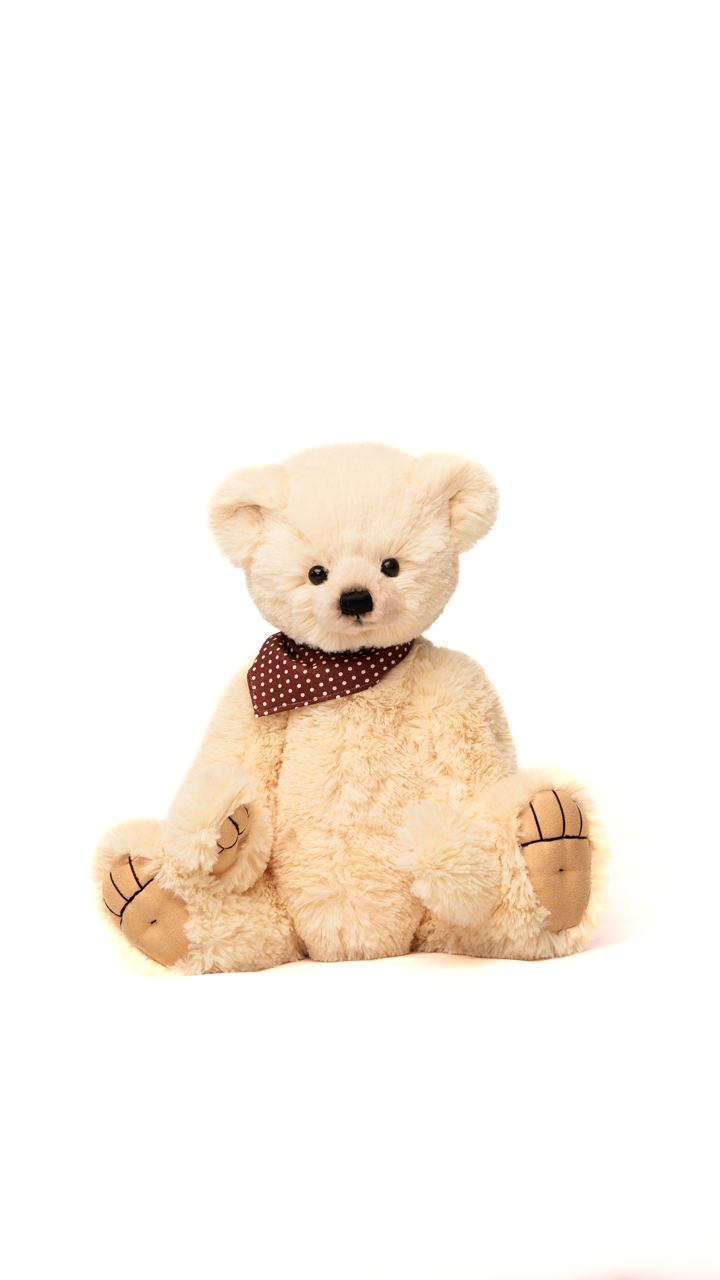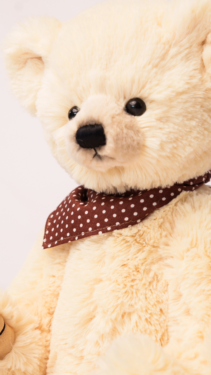 Teddy Javier is a generously sized soft plush teddy bear in cream. Fully jointed and 40 cm tall, he combines classic design with comforting softness.”